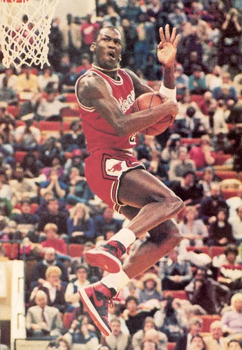 I looked to the heavens with a delirious, triumphant smile that only the divinity can inspire, extending my arms wide to embrace the praise of my disciples. It was as I began the second revolution of my victory twirl, someone pointed out that what I had on my feet did not at all resemble what his Airness donned on the hardwood. What I actually had on my feet were just white, red, and black Avias - women’s aerobics shoes.